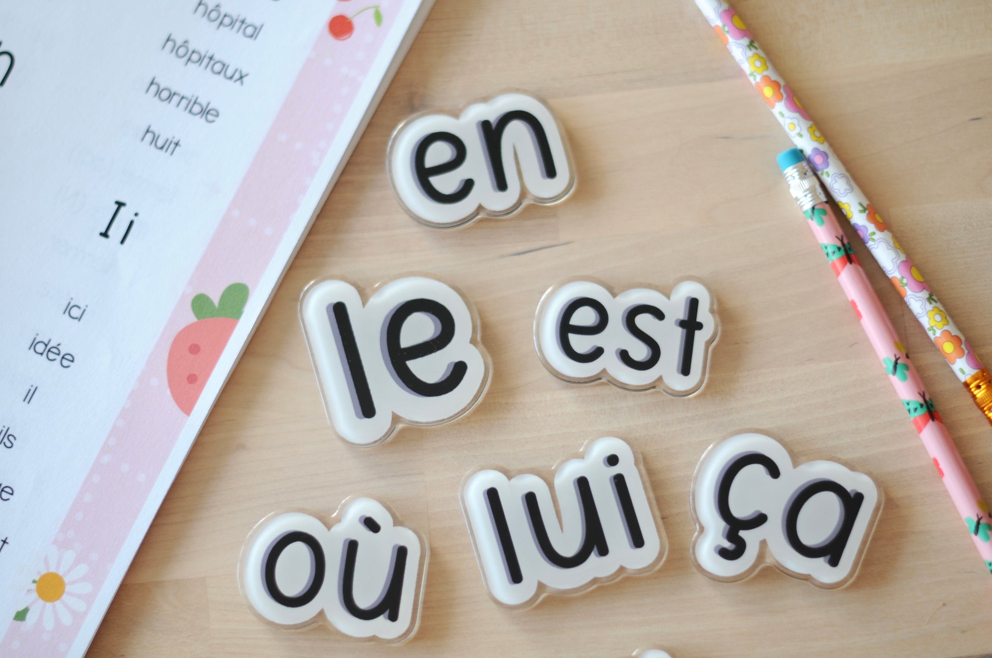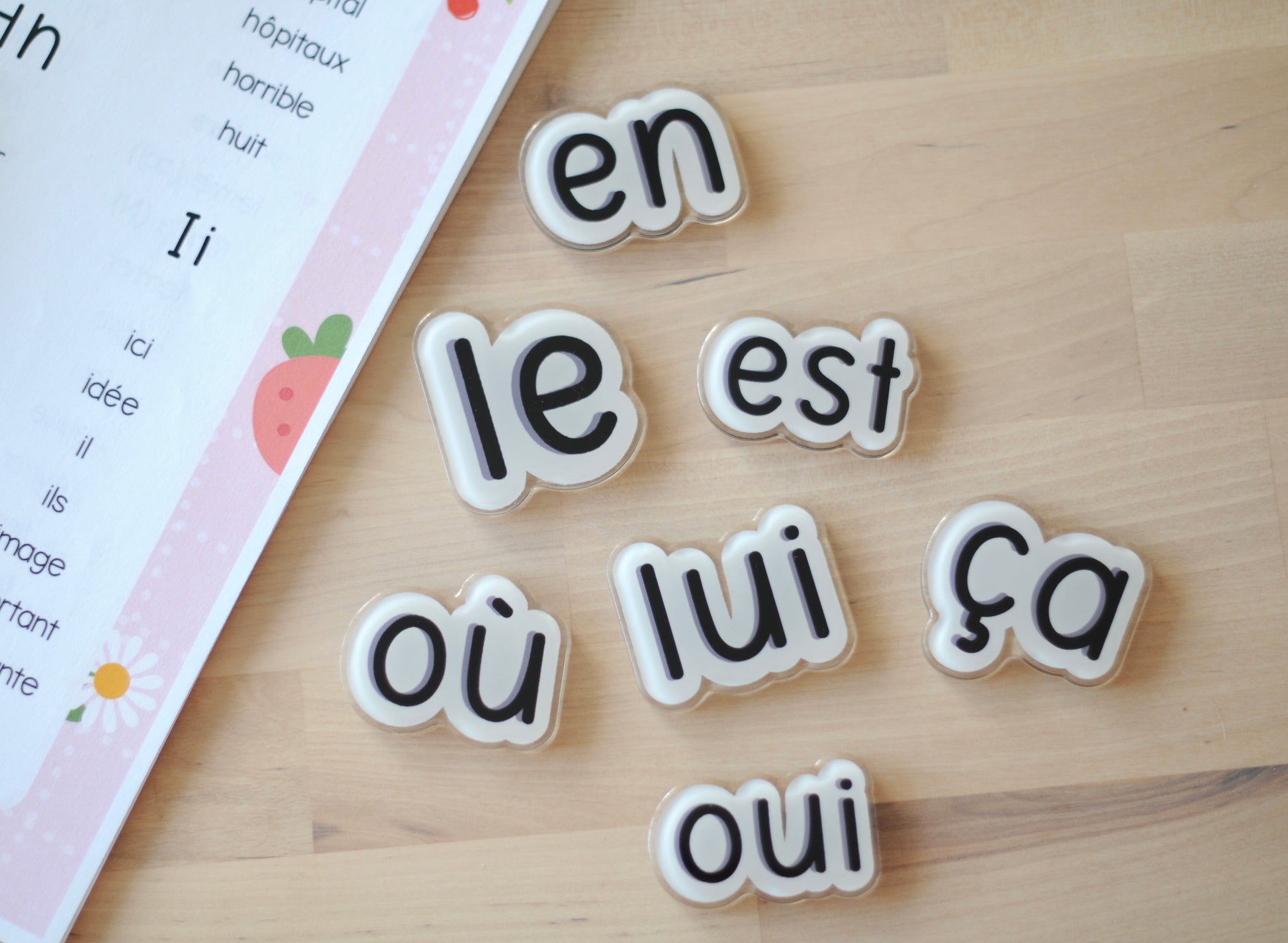 L’ensemble contient les mots fréquents : oui, ça, car, et, est, ici, du, le, la, les, un, une, il, elle, faire, il y a, en, où, lui, non, alors, aussi, avant, avec, dire, chez, sur, déjà, mais, donc, être, avoir, entre, toujours, derrière, chaque, dernier, premier, devant, autour, jamais, encore, pourtant, pouvoir, quand, savoir, sans, devoir, enfin, aller, venir, parfois, d'abord, ensuite, parce que, est-ce que, maintenant, pourquoi, comment, combien, après.